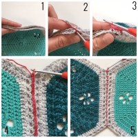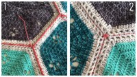 (2 st, 3 lm, 2 st) i nästa 3-lmb, *1 st i varje m fram till toppen på nästa hexagon (bild 3 ovan), 2 st var i nästa 2 m (dvs. de stolparna som virkades i 1-lmb på föregående varv (bild 4 ovan))* upprepa *till* fram till toppen på sista hexagonen. Virka sen 1 st i varje m fram till nästa lmb-3.