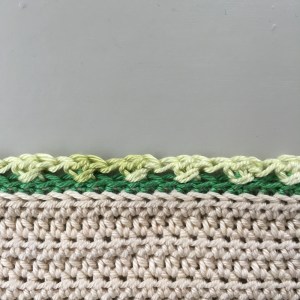Now we’ll change back to color C (make the last yarn over and pull through on the last dc2tog with color C) and then crochet 1 dc in the last st on row.