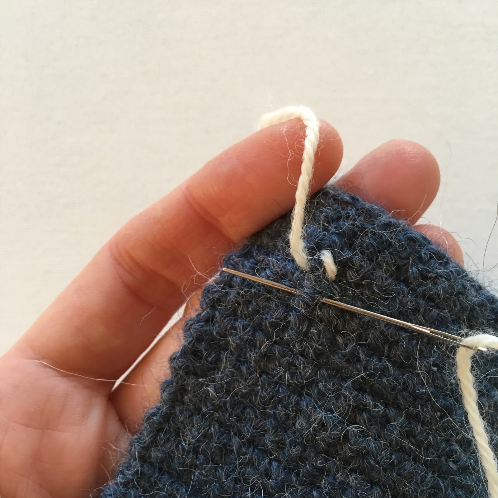Virka samman sidorna med fasta maskor (då blir sömmen inte lika stel som om man använder smygmaskor) genom maskorna på båda kanterna. När du kommer till öppningen för tummen så virkar du bara längs med ena kanten. Virka sen samman sista delen genom maskorna på båda kanterna.