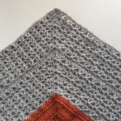 ch 2, dc2tog, ch 1, sk 2 st, 1 vst in next st *ch 1, sk 3 st, 1 vst in next st* repeat until 1 st before ch-2. Sk 1 st, (2 dc, ch 2, 2 dc) in ch-2.