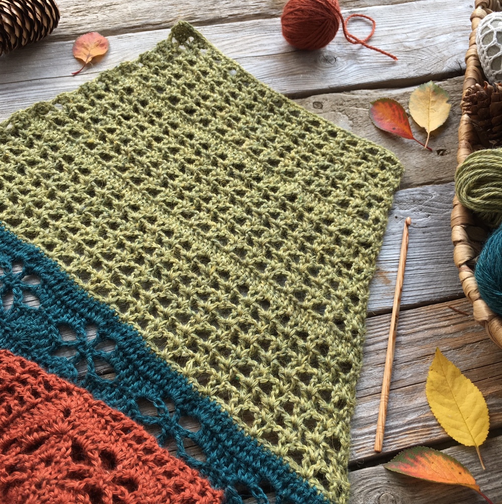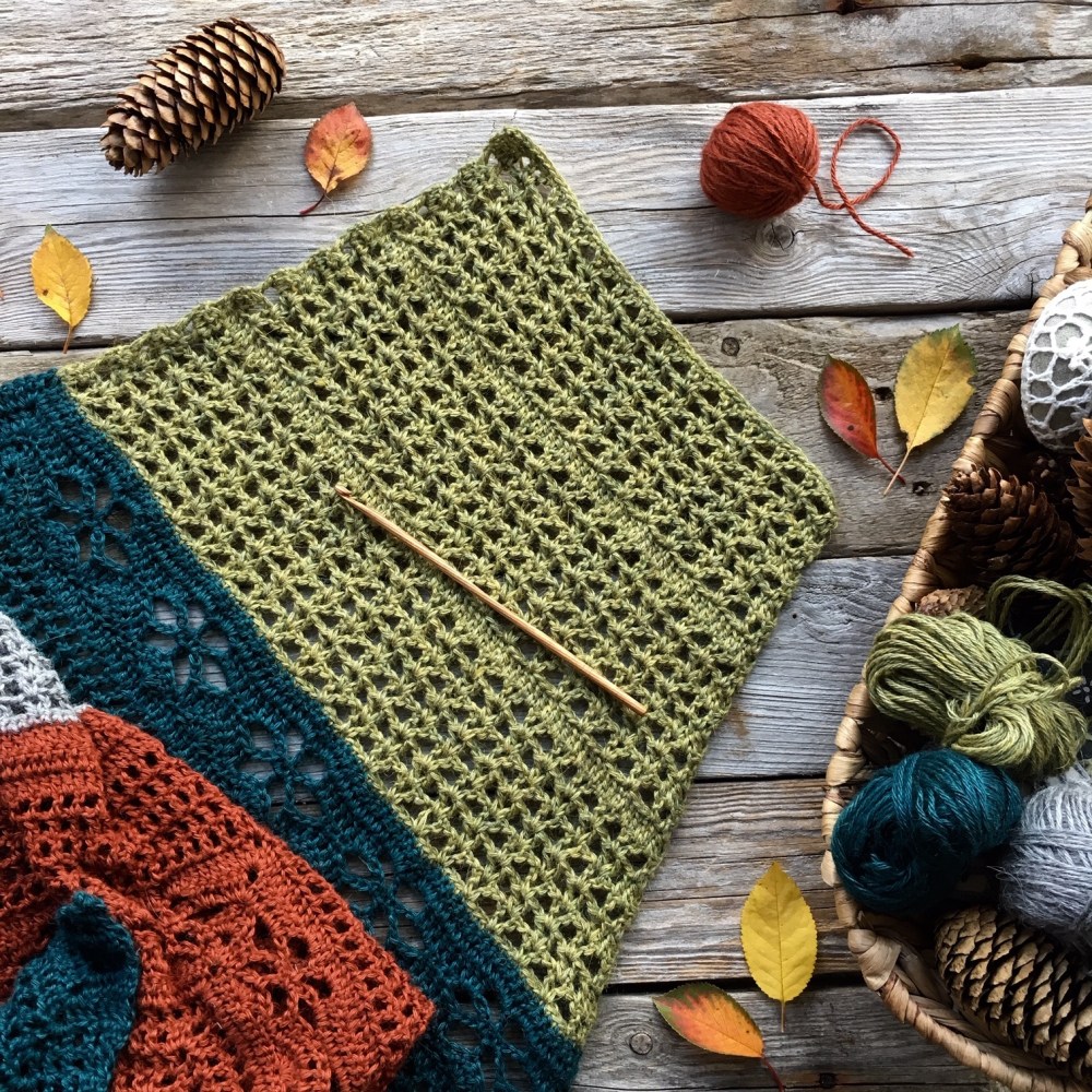 Time for part 5 of Höstfägring (Autumn Garden) CAL.We will now start to crochet in a different way than in the previous parts to form our shawl as a triangel. From now on we will only crochet on one side of the ch-2 that before was in the middle of each row. The rows will be shorter and shorter.