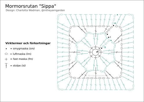 3 lm (räknas som 1 st), 1 st i nästa m, (2 st i nästa 2-lmb, 1 st i nästa m, 2 st i nästa 2-lmb, 1 st var i nästa 2 m, ( 2 st, 3 lm, 2 st ) i nästa 3-lmb, 1 st var i nästa 2 m) upprepa 4 gåmger men gör inte de 2 sista st på sista upprepningen. Avsluta varvet med 1 sm i 3:e lm. (På varje sida ska de nu vara 13 st. 3 lm i varje hörn.)